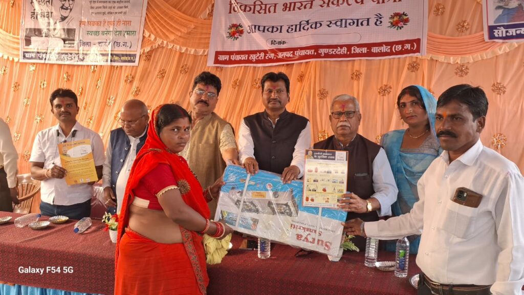 गुण्डरदेही/ गुण्डरदेही विकासखंड के ग्राम खुटेरी रंग में विकसित भारत संकल्प यात्रा शिविर आयोजित की गयी इस शिविर मे हितग्राहियो को शासन की जन कल्याणकारी योजनाओं से लाभान्वित करने के लिए आयोजन किया जा रहा है शिविर मे पहुंचे ग्रामीणों का स्वास्थ्य प्रशिक्षण एवं स्वच्छता की शपथ दिलाई गई