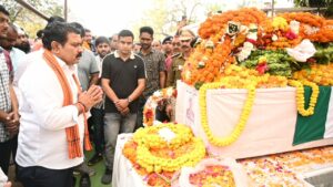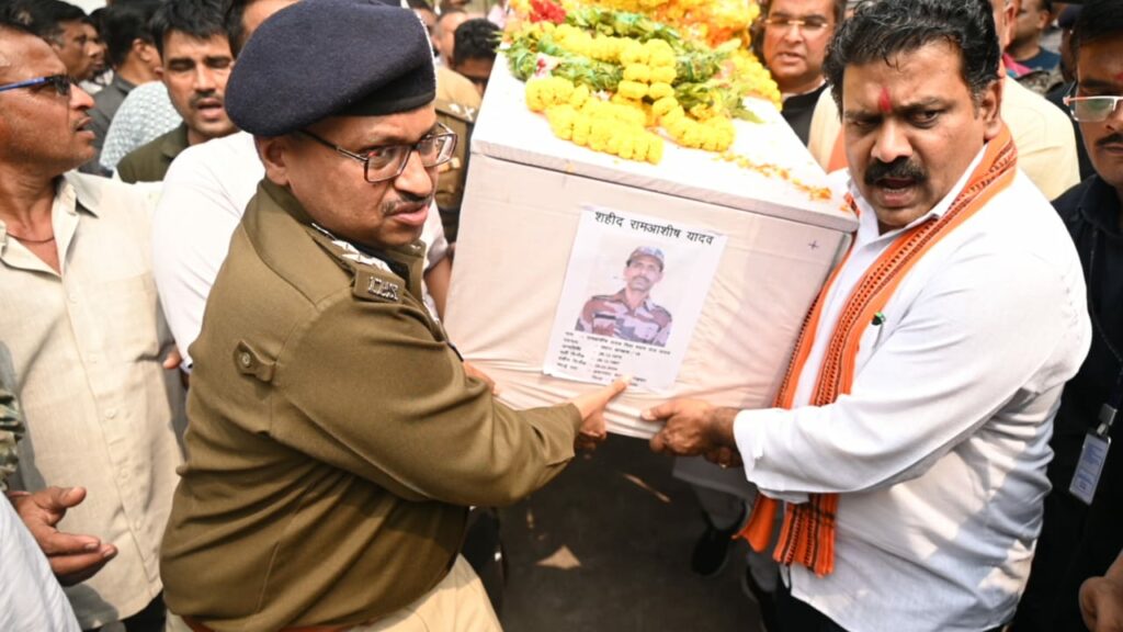 साथ ही शासन स्तर पर हर संभव सहयोग कर भरोसा दिलाया। ज्ञात हो कि विगत दिवस बीजापुर जिले में गस्त के दौरान आईईडी ब्लास्ट की चपेट में आने से सीएएफ जवान प्रधान आरक्षक राम आशीष शहीद हो गए। उनका पार्थिव देह आज दोपहर 12.30 बजे चापर विमान से भिलाई लाया गया। भिलाई सेक्टर 2 स्थित निवास में परिजनों एवं पड़ोसियों के अंतिम दर्शनार्थ रखा गया। यहां पर प्रदेश के गृहमंत्री श्री विजय शर्मा, सांसद श्री विजय बघेल, विधायक श्री ललित चंद्राकर, श्री गजेंन्द्र यादव एवं नागरिकगण तथा आईजी श्री आर.जी. गर्ग, कलेक्टर सुश्री ऋचा प्रकाश चौधरी, पुलिस अधीक्षक श्री जितेन्द्र शुक्ला एवं अन्य अधिकारियों ने शहीद जवान के पार्थिव देह पर पुष्पांजली अर्पित कर श्रद्धांजली दी। तत्पश्चात् शहीद जवान श्री राम आशीष का पार्थिव देह अंतिम संस्कार के लिए गृह ग्राम असनवार जिला बलिया उत्तरप्रदेश के लिए रवाना किया गया। शहीद जवान का अंतिम संस्कार गृहग्राम में किया जाएगा।
