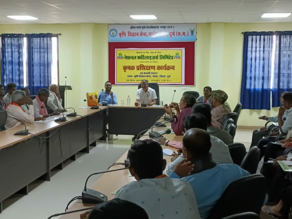 कृषि विज्ञान केंद्र पाहांदा मे नेशनल फ़र्टिलाइजर्स लिमिटेड (भारत सरकार का उपक्रम) द्वारा कृषक प्रशिक्षण कार्यक्रम का आयोजन किया गया। प्रशिक्षण कार्यक्रम में उपस्थित कृषि विज्ञान केंद्र के प्रमुख श्री विजय जैन द्वारा किसानों को उर्वरक प्रबंधन एवं जैविक कृषि के बारे में जानकारी दी गई। नेशनल फर्टिलाइजर्स लिमिटेड के क्षेत्रीय प्रबंधक, श्री एस के भगत द्वारा यूरिया गोल्ड एवं ड्रोन तकनीक का कृषि में उपयोग एवं इसके फायदे के बारे में विस्तृत से जानकारी दी, साथ ही सल्फर के उपयोग के बारे मैं किसानो को जानकारी दी गई। वैज्ञानिक श्री ईश्वरी कुमार साहू, ने किसानों को वर्तमान फसल के किट प्रबंधन कर बारे में विस्तृत जानकारी किसानों को दी गई। इस अवसर पर संयुक्त संचालक कृषि, दुर्ग संभाग श्री राजेश राठौर ने डी बी टी के बारे में किसान बन्धुओं को विस्तृत जानकारी दी। कार्यक्रम का संचालन, कृषि विज्ञान केंद्र, के वैज्ञानिक श्री कमल नारायण वर्मा द्वारा क्या गया। कार्यक्रम का समापन किसान भाइयों को इनाम स्वरूप बेंटोनिट सल्फर दिया गया।