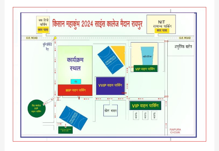 Kisan Mahakumbh रायपुर .. ‘‘किसान महाकुंभ‘‘ कार्यक्रम आयोजित है 9 मार्च दिन शनिवार को साइंस कालेज मैदान में होने जा रहा है जिसमें राजनाथ सिंह केन्द्रीय रक्षामंत्री, भारत शासन का शामिल होना प्रस्तावित है। उक्त कार्यक्रम में छत्तीसगढ़ के विभिन्न जिलों से काफी संख्या में किसान सम्मिलित होंगे। डीएसपी गुरजीत सिंह ने बताया कि कार्यक्रम में सम्मिलित होने वाले व्हीआईपी एवं किसानों के सुरक्षित एवं सुगम आवागमन तथा वाहनों की पार्किंग के लिए निम्नानुसार मार्ग व्यवस्था व पार्किंग स्थल निर्धारित किया गया हैः-