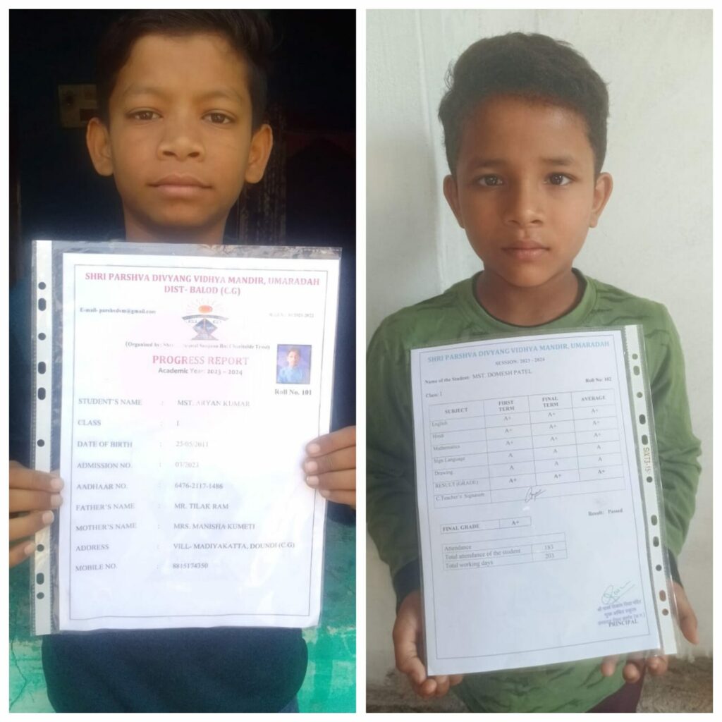 बालोद- बालोद जिला मुख्यालय से लगे ग्राम उमरदाह में सुल्तानमल सजनादेवी चैरिटेबल ट्रस्ट के अंतर्गत बालोद के बाफना परिवार द्वारा दिव्यांग बच्चो के लिए निःशुल्क श्री पार्श्वनाथ दिव्यांग मुखबधिर स्कूल का संचालन विगत एक वर्षो से कर रहा है जहाँ पर अभी वर्तमान में 16 बच्चें वहां हॉस्टल में रहकर पढ़ाई कर रहे है जिसका वार्षिक रिजल्ट आ चुका है जिसमे सभी बच्चों ने परीक्षा उत्तीर्ण की है ।