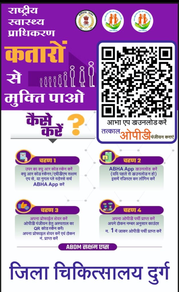दुर्ग, 18 मई 2024/ राज्य नोडल एजेंसी छत्तीसगढ़/ शासकीय मेडिकल कालेज, जिला अस्पताल एवं अन्य स्वास्थ्य सुविधा संस्थानों में अब मरीजों को ओपीडी पर्ची बनाने के लिए लंबी लाईन लगाने की आवश्यकता नहीं पड़ेगी। अब आयुष्मान भारत डिजिटल मिशन का आभा मोबाइल एप गूगल प्ले स्टोर से डाउनलोड करें और आभा एप के माध्यम से परिजन एवं मरीज रजिस्ट्रेशन करेंगे तथा ओपीडी काउंटर के पास लगे क्यूआर कोड को स्कैन और शेयर कर लंबी कतारों से बचें। ये सुविधा अब दुर्ग जिला अस्पताल में भी उपलब्ध हो गया है। सभी हितग्राहियों से अपेक्षा है कि इसका ज्यादा से ज्यादा लाभ उठाए।
