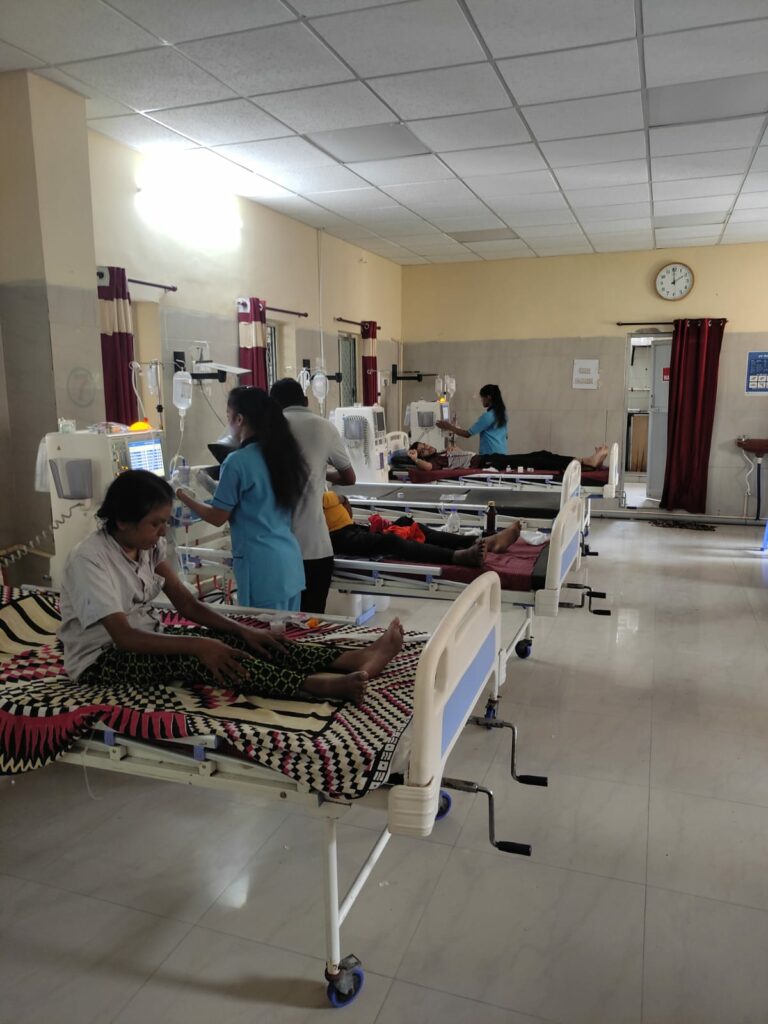 जिला चिकित्सालय दुर्ग में प्रधानमंत्री निःशुल्क डायलिसिस योजना के अंतर्गत मात्र 02 डायलिसिस मशीने थी, इस निःशुल्क डायलिसिस योजना के अंतर्गत एस्काग संजीवनी द्वारा डायलिसिस यूनिट का संचालन किया जा रहा है। पूर्व में सिर्फ 50-55 डायलिसिस हो पाता था। सिविल सर्जन डॉ. हेमंत साहू से मिली जानकारी अनुसार निःशुल्क डायलिसस प्रोगाम के अंतर्गत फेयर फैक्स ट्रस्ट द्वारा वर्ष 2019 में जिला चिकित्सालय दुर्ग को 05 मशीने प्राप्त हुई है। जिसमें वर्तमान में 350-400 डायलिसिस प्रति माह हो रहे है। जिला चिकित्सालय द्वारा आयरन सुक्रोस जिसकी कीमत 350-400 रूपये है, जिसे रोगियों को निःशुल्क प्रदाय किया जाता है। जिसे समय-समय पर शासन द्वारा प्राप्त होने पर इंजेक्शन एरिथ्रोपोइटिन भी रोगियों को निःशुल्क दिया जाता है। जिसकी बाजार में कीमत 1800-2000 रूपये है। वर्तमान में किडनी के गंभीर मरीजों को डायलिसस नोडल ऑफिसर डॉ. देवेन्द्र साहू द्वारा सेंट्रल लाइन लगाया जा रहा है, जिससे रोगियों को बाहर नहीं जाना पड़ता है। यहां हेपेटाइटीस-सी के रोगियों को शासन स्तर से प्राप्त मेडिसिन भी निःशुल्क उपलब्ध कराया जा रहा है। जिसका बाजार मूल्य 10-15 हजार रूपये है। जिला चिकित्सालय दुर्ग में प्रतिमाह लाभांवित मरीजों की संख्या 38-40 एवं प्रतिमाह डायलिसिस 350-400 होता है एवं प्रतिवर्ष लगभग 5500-6000 मरीजों का निःशुल्क डायलिसिस किया जा रहा है।