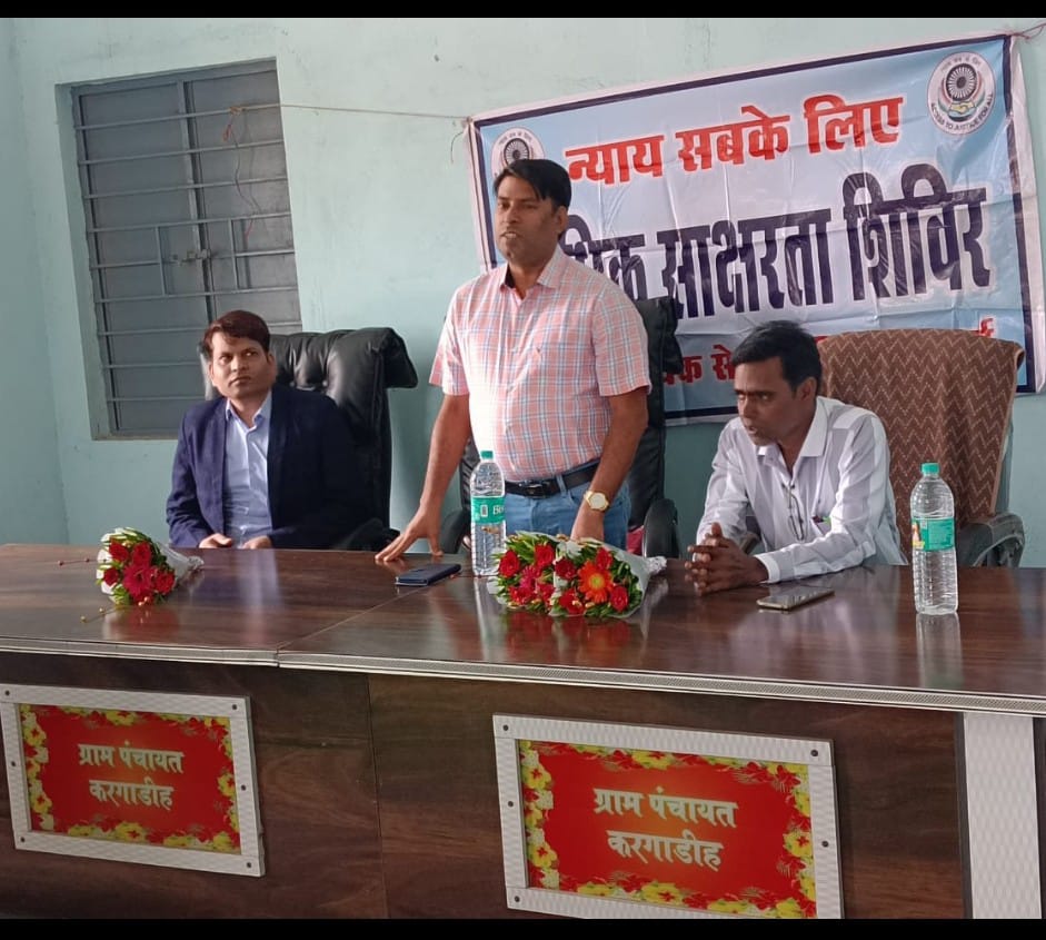 अंडा /दुर्ग // दूर्ग ग्रामीण बिधानसभा के ग्राम पंचायत करगाडीह मे जिला न्यायलय दुर्ग द्वारा विधिक साक्षरता शिविर का आयोजन किया गया | जिसमे अपर सत्र न्यायाधीश दीपक कोसले व न्यायिक मजिस्ट्रेट पुनीत राम गुरुपंच ने उपस्थित ग्रामीणों को साइबर क्राइम, घरेलु हिंसा, यातायात नियम, पारिवारिक विवाद, टोनही प्रताड़ना, बाल विवाह से संबंधित कानूनी जानकारी दी | इस अवसर पर सरपंच घनश्याम गजपाल, मन्नूलाल साहू, जामवंत गजपाल,भेखचंद साहू, महेश साहू,सुरेश चक्रधारी,खिलेश्वर साहू, अश्वनी साहू,पुनारद साहू,धनेशवरी साहू सहित महिलाए,ग्रामीणजन व पुलिस स्टाप उपस्थिति रहे।