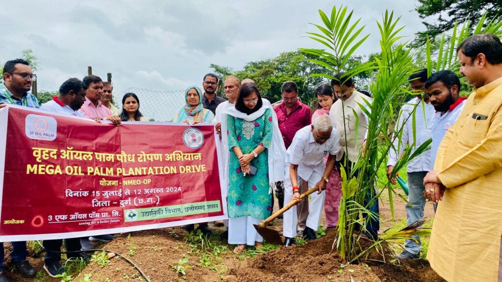 दुर्ग, जिले के धमधा विकासखण्ड अंतर्गत ग्राम चेटूवा में विधायक श्री डोमन लाल कोर्सेवाड़ा और कलेक्टर सुश्री ऋचा प्रकाश चौधरी की मौजूदगी में ऑयल पॉम पौधरोेेपण किया गया। वृहद् ऑयल पॉम पौधरोपण कार्यक्रम अंतर्गत 3 एफ ऑयल पॉम कंपनी और उद्यानिकी विभाग के तत्वाधान में कृषक श्री जगदीश सोलंकी रकबा 5.00 हेक्टेयर के प्रक्षेत्र में पॉम ऑयल पौधे का रोपण किया गया। विधायक श्री कोर्सेवाड़ा ने स्वयं भी ऑयल पॉम पौधरोपण किया।