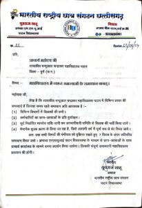 युवराज साहू जो की एनएसयूआई विधानसभा अध्यक्ष है उन्होंने महाविधालय प्रबंधन को चेतावनी देते हुए कहा की अगर समस्या का समधन नही हुआ तो 7 दिन बाद जमीन में बैठ कर धरना देंगे महाविधालय के छात्र के साथ उन्होंने कहा की छात्र हित में जिस हद का लड़ाई लड़ना पड़े वो लड़ेंगे और अधिकार दिलाएंगे उक्त चर्चा में मुख्य रूप से ,विकाश सिन्हा, विजय निषाद, धर्मेंद्र सिन्हा , योगेश सिन्हा , रोहन बघेल , पूनम वर्मा , रूपाली पवार , भारती ठाकुर , जानकी बंजारे…सभी उपस्थित थे