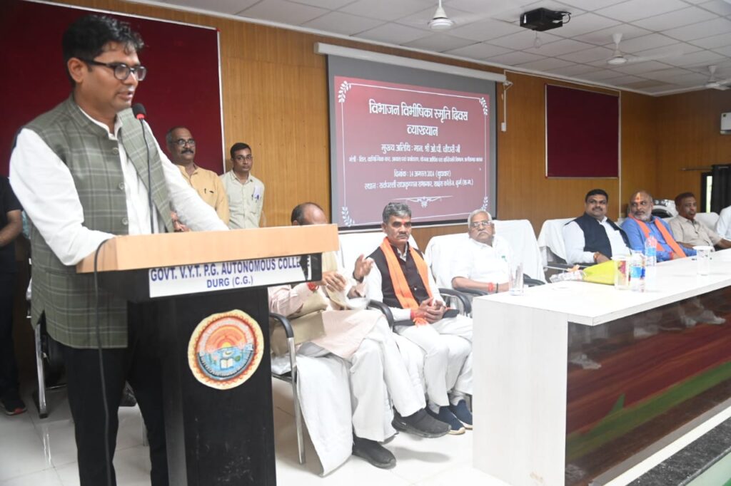 दुर्ग, वित्त, वाणिज्यिक कर, आवास एवं पर्यावरण मंत्री श्री ओ.पी. चौधरी आज दुर्ग स्थित साईंस कॉलेज ऑडिटोरियम में आयोजित विभाजन विभीषिका स्मृति दिवस 14 अगस्त कार्यक्रम में शामिल हुए। विभाजन विभीषिका कार्यक्रम को सम्बोधित करते हुए कहा कि 15 अगस्त 1947 को मिली आजादी से एक दिन पहले हुए भारत के विभाजन और पूर्वजों के बलिदान की याद में 14 अगस्त को ’विभाजन विभीषिका स्मृति दिवस’ के रूप में मनाया जाता है। उन्होंने भारतीय संस्कृति को विश्व की प्राचीन संस्कृतियों से एक बताते हुए यहां की विशिष्टता से अवगत कराया। साथ ही उन्होंने भारतीय संस्कृति से जुड़े अनेक उदाहरण दिए।