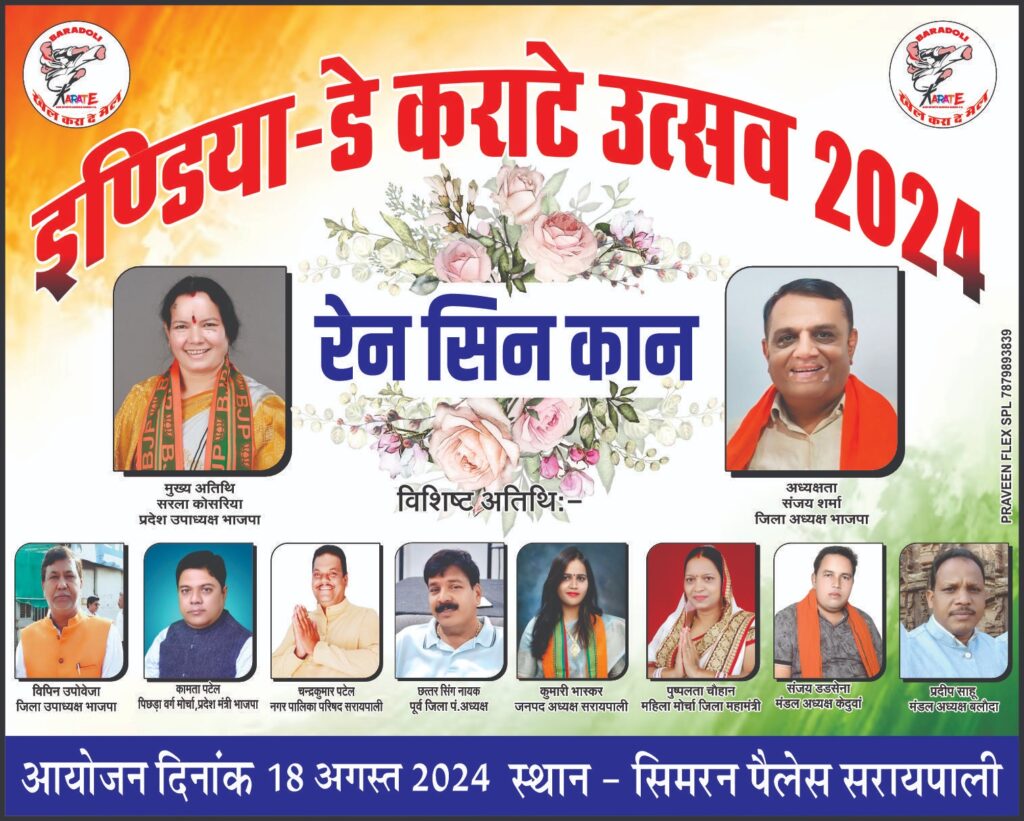 सरायपाली – साहित्य साधना सभा छत्तीसगढ़ के खेल शाखा बाराडोली कराते एवं खेल साधना सभा के तत्वाधान में इंडिया डे रेन सीन कान कराते उत्सव 2024 का आयोजन सिमरन पैलेस सरायपाली में किया गया।जिसमें मुख्य अतिथि सरला कोसरिया प्रदेश उपाध्यक्ष भाजपा,अध्यक्षता संजय शर्मा भाजपा जिला अध्यक्ष महासमुंद,विशिष्ट अतिथि विपिन उपवेजा भाजपा जिला उपाध्यक्ष महासमुंद,चंद्रकुमार पटेल मिलु अध्यक्ष नगर पालिका परिषद सरायपाली,कुमारी धनेश्वर भास्कर अध्यक्ष जनपद पंचायत सरायपाली,पुष्पलता चौहान भाजपा महिला मोर्चा जिला महामंत्री,छत्तर सिंह नायक पूर्व जिला पंचायत अध्यक्ष महासमुंद,संजय डडसेना भाजपा मंडल अध्यक्ष केदुवां,प्रदीप साहू भाजपा मंडल अध्यक्ष बलौदा,स्वर्णजीत सिंह सलूजा सभापति व पार्षद,सीता सतपती पार्षद के आतिथ्य में कार्यक्रम सम्पन्न हुआ।अतिथियों द्वारा मां सरस्वती की पूजा अर्चना के साथ कार्यक्रम का शुभारंभ किया,सरस्वती वंदना शिवराम साव ने प्रस्तुत किया।स्वतंत्रता दिवस को विशेष बनाने के लिए इंडिया डे रेन सीन कान कराते उत्सव के रूप में लगभग 10 जिलों के खिलाड़ी इस कार्यक्रम में शामिल हुए,जहां कराते प्रशिक्षण के साथ-साथ योग,काता प्रदर्शन और कराते के संबंध में अति महत्वपूर्ण जानकारी प्रदान किया गया। बाराडोली कराते एवं खेल साधना सभा के मुख्य कोच देवनारायण बरीहा,त्रिलोचन पटेल प्रशिक्षण प्रभारी,मुरलीधर डडसेना,गणेश तरिया,जयंती साहू महिला मुख्य कोच,अनीता बरिहा,प्रमोद मांझी,यशवंत जाल,बृजलाल साव ने खिलाड़ियों और सभी कोच को कराते के बारीकियों के बारे में सिखाया।मुख्य अतिथि सरला कोसरिया ने वर्तमान समय में घट रही घटनाओं का जिक्र करते हुए कहा कि बेटियों को शास्त्र के साथ शस्त्र भी उठाना आवश्यक हो गया है जिसके लिए उन्हें कराते सीखकर आत्मरक्षा करना चाहिए।अतिथियों ने अपने उद्बोधन में इस खेल को सरायपाली के साथ ही साथ छत्तीसगढ़ में बढ़ावा देने के लिए भोजराज साहू के प्रयासों की भूरी भूरी प्रसंशा की और इस खेल को बढ़ाने के लिए हर संभव मदद करने का आश्वासन दिया।