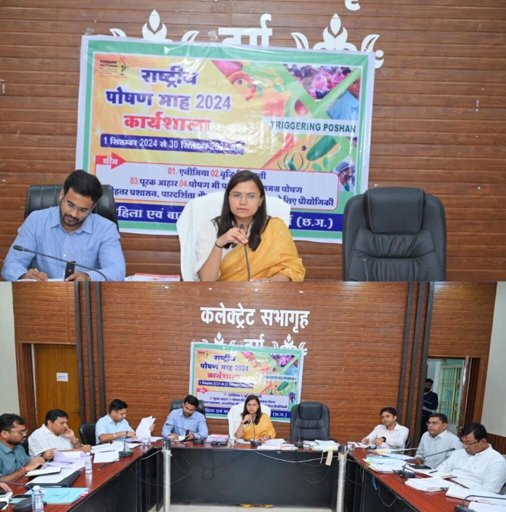 दुर्ग, 27 अगस्त 2024/ कलेक्टर सुश्री ऋचा प्रकाश चौधरी के निर्देशानुसार जिले में सक्षम आंगनबाड़ी एवं पोषण 2.0 अंतर्गत 01 सितम्बर 2024 से 30 सितम्बर 2024 तक पोषण माह का आयोजन किया जा रहा है। इसी संबंध में आज कलेक्टर सुश्री चौधरी की अध्यक्षता में कलेक्ट्रेट सभागृह में बैठक का आयोजन किया गया। बैठक में कलेक्टर ने संबंधित अधिकारियों से अभियान के क्रियान्वयन की विस्तारपूर्वक जानकारी ली। महिला एवं बाल विकास विभाग अधिकारी श्री अजय शर्मा ने अवगत कराया कि इस योजना का संचालन 01 अगस्त 2022 से किया जा रहा है। पूर्व वर्षों में आयोजित पोषण माह/पोषण पखवाड़ों में विभिन्न सहयोगी विभागों एवं डेव्हलेपमेंट संस्थाओं का सकिय एवं परिणाममूलक सहयोग प्राप्त होता रहा है। जनसमुदाय तक स्वास्थ्य पोषण एवं स्वच्छता संबंधित व्यापक एवं प्रभावी व्यवहार परिवर्तन हेतु जनआंदोलन के रूप में प्रतिवर्ष राष्ट्रीय पोषण माह का आयोजन किया जा रहा है।