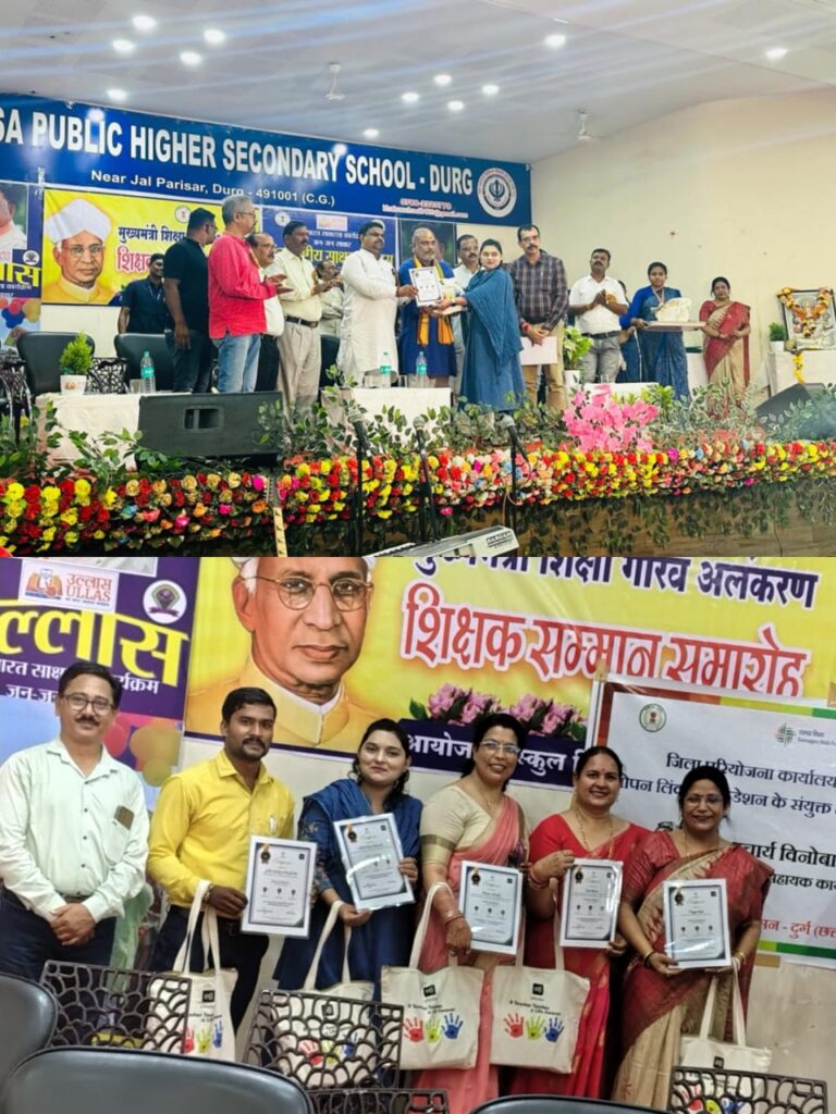 दुर्ग, 11 सितंबर 2024/ जिला प्रशासन समग्र शिक्षा परियोजना कार्यालय जिला दुर्ग के सहयोग से संचालित आचार्य विनोबा भावे शिक्षक सहायक कार्यक्रम के अंतर्गत जिले में पोस्ट ऑफ द मंथ जुलाई और अगस्त माह के जिला स्तर के विजेता शिक्षकों को दुर्ग शहरी विधायक श्री गजेंद्र यादव एवं दुर्ग ग्रामीण विधायक श्री ललित चंद्राकर द्वारा प्रमाणपत्र एवं गिफ्ट देकर सम्मानित किया गया।
