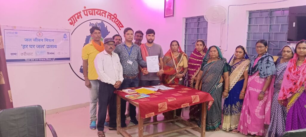 दुर्ग, 09 अक्टूबर 2024/ जल जीवन मिशन योजना के तहत जिले के पाटन विकासखण्ड ग्राम व पंचायत तर्रीघाट में हर घर जल उत्सव मनाया गया। इस दौरान सरपंच श्री अशोक साहू एवं सचिव श्री जानचन्द्र चक्रधारी एवं जल जीवन मिशन के कर्मचारी समस्त ग्रामीण उपस्थित थे। जल जीवन मिशन योजना को पी.एच.ई. विभाग द्वारा ग्राम पंचायत तर्रीघाट को सौंपा गया। आने वाले समय में इस योजना का संचालन व रख-रखाव ग्राम पंचायत द्वारा किया जाएगा। कार्यक्रम के दौरान जल कर, सामुदायिक सहभागिता, स्वामित्व भावना से योजना का संचालन करने के साथ ही विशेष तौर पर वर्षाकालीन वर्षा जल संरक्षण कर प्रदूषण मुक्त शुद्ध पानी पीने के फायदे के बारे में बताया गया।