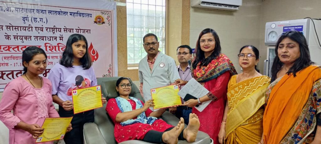 दुर्ग, 17 अक्टूबर 2024/ कलेक्टर सुश्री ऋचा प्रकाश चौधरी के मार्गदर्शन में आज जिला अस्पताल में रक्तदान शिविर का आयोजन किया गया। शासकीय डॉ. वा. वा. पाटणकर कन्या स्नातकोत्तर महाविद्यालय दुर्ग के यूथ रेडक्रास सोसायटी एवं राष्ट्रीय सेवा योजना अंतर्गत महाविद्यालय के टीचर एवं स्टाफ द्वारा 7 यूनिट रक्तदान किया गया। इस शिविर में कलेक्टर सुश्री चौधरी ने भी रक्तदान किया। सीएमएचओ डॉ. मनोज दानी, मलेरिया नोडल अधिकारी डॉ. सीबीएस बंजारे, सीएस डॉ. हेमंत साहू, अस्थि रोग विशेषज्ञ डॉ. राजकुमार नायक, डीपीएम डा. भूमिका वर्मा, हॉस्पिटल कंसलटेंट डॉ. ओपी वर्मा, मैट्रन श्रीमती चित्ररेखा बोरकर, नर्सिंग इंचार्ज श्रीमती मंजू राय, श्रीमती देव जनिक शिवहरे, ब्लड बैंक के नोडल अधिकारी डॉ. प्रवीण अग्रवाल, डॉ. अविनाश, नर्सिंग आफिसर सती गुप्ता तरुणा रावत, काउंसलर टीएस एंथोनी, लैब टेक्नोलॉजीस्ट रोशन सिंह, लैब इंचार्ज रूपेश सरपे, लैब टेक्नीशियन महेंद्र चंद्राकर, निगार, मिनाक्षी, सूरज, हिमांशु चंद्राकर, कौशल साहू, माला प्रशिक्षणार्थी रिया, धनेश्वरी, यशवंत एवं रेड क्रॉस सोसाइटी के प्रबंध कारिणी सदस्य और जीवन दीप समिति के आजीवन सदस्य दिलीप ठाकुर, जीवन दीप समिति के सदस्य प्रशांत डोंगावकर की उल्लेखनीय भूमिका और सकारात्मक सहयोग रहा और सभी ने रक्तदाताओं को साधुवाद देकर उनके उज्जवल भविष्य की कामना की।