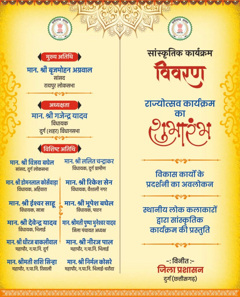 दुर्ग, 04 नवंबर 2024/ राज्य शासन के निर्देशानुसार एवं कलेक्टर सुश्री ऋचा प्रकाश चौधरी के मार्गदर्शन में जिले के पुरानी गंज मंडी गंजपारा दुर्ग में कल राज्योत्सव का आयोजन किया जा रहा है। इस भव्य समारोह में सांसद श्री बृजमोहन अग्रवाल मुख्य अतिथि के रूप में उपस्थित रहेंगे तथा दुर्ग शहर विधायक श्री गजेंद्र यादव कार्यक्रम की अध्यक्षता करेंगे। उक्त आयोजन में सांसद, दुर्ग शहर एवं ग्रामीण क्षेत्र के विधायक सहित जिला पंचायत अध्यक्ष एवं महापौर विशिष्ट अतिथि के रूप में शामिल होंगे। इनमें लोकसभा सांसद श्री विजय बघेल, दुर्ग ग्रामीण विधायक श्री ललित चंद्राकर, अहिवारा विधायक श्री डोमन लाल कोर्सेवाड़ा, वैशाली नगर विधायक श्री रिकेश सेन, साजा विधायक श्री ईश्वर साहू, पाटन विधायक श्री भूपेश बघेल, भिलाईनगर विधायक श्री देवेंद्र यादव, जिला पंचायत अध्यक्ष श्रीमती पुष्पा भुनेश्वर यादव, महापौर नगर पालिका निगम दुर्ग श्री धीरज बाकलीवाल, महापौर नगर पालिका निगम भिलाई श्री नीरज पाल, महापौर नगर पालिका निगम रिसाली श्रीमती शशि सिन्हा, महापौर नगर पालिका निगम भिलाई चरोदा श्री निर्मल कोसरे शामिल हैं। राज्योत्सव में विभिन्न विभागों द्वारा प्रदर्शनियों द्वारा अपनी-अपनी उपलब्धियों का प्रदर्शन किया जाएगा। इनमें जिला पंचायत, महिला एवं बाल विकास, स्वास्थ्य विभाग, आयुष, सिंचाई, कृषि, उद्यानिकी, मत्स्य पालन, पशु चिकित्सा, आदिवासी विकास विभाग, जिला सहकारिता एवं केन्द्रीय बैंक, जिला रोजगार एवं स्वरोजगार मार्गदर्शन केन्द्र, शिक्षा विभाग, खाद्य विभाग, पंजीयन विभाग/हाउसिंग बोर्ड, सीएसपीडीसीएल/क्रेडा, जनसंपर्क विभाग, उद्योग विभाग, समाज कल्याण, नगरीय निकाय, हेमचंद यूनिवर्सिटी, जिला परिवहन, श्रम विभाग, लोक निर्माण विभाग, प्रधानमंत्री ग्राम सड़क योजना एवं मुख्यमंत्री ग्राम सड़क योजना शामिल हैं। राज्योत्सव में सांस्कृतिक कार्यक्रमों का भी आयोजन किया जाएगा। जिसमें स्थानीय लोक कलाकारों द्वारा रंगारंग एवं मनमोहक प्रस्तुतियां दी जाएंगी। जिसमें सत्यदीप नृत्य दल द्वारा पंथी नृत्य, रेनू साहू द्वारा पंडवानी, रानी नंदिनी चौधरी एवं दल द्वारा कत्थक एवं छत्तीसगढ़ी नृत्य तथा लीलाधर साहू एवं दल द्वारा संस्कृत लोकनाचा शामिल है। इसके आलावा गायिका किरण शर्मा भी अपनी विविध प्रस्तुति देंगी।
