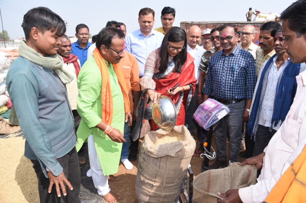 दुर्ग, 14 नवंबर 2024/ छत्तीसगढ़ में किसानों का पर्व याने धान खरीदी की शुरूआत हो चुकी है। मुख्यमंत्री श्री विष्णुदेव साय के निर्देशानुसार जिले के धान खरीदी केंद्रों में व्यवस्था अपग्रेड कर किसानों को सुविधा देने उन्नत तकनीक का उपयोग किया जा रहा है। संभाग आयुक्त श्री सत्यनारायण राठौर एवं कलेक्टर सुश्री ऋचा प्रकाश चौधरी ने आज धान खरीदी केंद्रों का निरीक्षण किया। सेवा सहकारी समिति मर्यादित करंजा के करंजा भिलाई स्थित उपार्जन केंद्र में उन्होंने तौल मशीन की पूजा अर्चना कर धान खरीदी का शुभारंभ किया। उपार्जन केंद्र करंजा भिलाई में संभागायुक्त श्री राठौर एवं कलेक्टर सुश्री चौधरी ने किसानों की मौजूदगी में निर्धारित समर्थन मूल्य पर धान खरीदी का शुभारंभ किया। उन्होंने टोकन प्राप्त 4 किसानों से 288 क्विंटल धान खरीद कर धान खरीदी की शुरुवात की। सर्वप्रथम किसान श्री भोला साहू ने धान बेचने की कार्यवाही की। संभागायुक्त श्री राठौर एवं कलेक्टर सुश्री चौधरी ने श्रीफल भेंट कर किया किसानों का स्वागत किया। इसके अलावा ग्राम पंचायत करंजा, समुदा, जिंजरी तथा बासिन 4 ग्राम पंचायत के 10 किसानों ने धान बेचा। इसी प्रकार कोड़िया ग्राम पंचायत में स्थित सहकारी समिति में 15 किसानों के माध्यम से 903.60 क्विंटल धान बेचा गया।