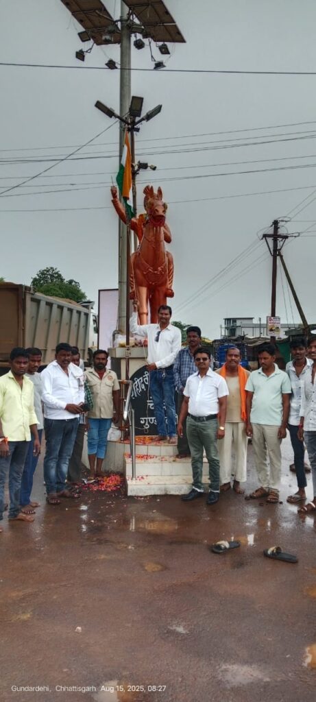 गुण्डरदेही/छ. ग. सर्व आदिवासी समाज एवं सर्व समाज ने छ. ग. के प्रथम स्वतंत्रता संग्राम सेनानी शहीद वीर नारायण सिंह चौक गुण्डरदेही में थानसिंह मंडावी ने ध्वजा रोहण किया, मंडावी ने कहा कि हमारा देश उन देश भक्तों की याद दिलाती है जिन्होंने हमारे देश को आजाद कराने में अपने प्राणों की बलिदान दे दिए जैसे सुभाष चंद्र बोस, तात्या टोपे, रानी लक्ष्मी बाई, शहीद वीर नारायण सिंह, खुदीराम बोस, रानी दुर्गावती इत्यादि, हमारा देश 15 अगस्त सन 1947 को आजाद हुआ जिसकी खुशी में स्वतंत्रता दिवस बड़ी धूम धाम से मनाई जाती है और समस्त देशवासियों को स्वतंत्रता दिवस की बधाई दी इस अवसर पर पार्षद संतोष नेताम, तुलसी ठाकुर, तिलक कुंजाम, टेक राम मंडावी, योगेश्वर साहू, प्रकाश नेताम, दिलेंद्र निषाद, हितेश कुंजाम, इंदर नेताम, रूपेश यादव, संतोष महोबिया, गजानंद निषाद, मनोज राजपूत, राकेश कुंजाम, जहांगिर खा, खिलेश चक्रधारी, करण निषाद, अक्षय यादव, सुभाष चंद्राकर, तुलसी सोनकर सहित गणमान्य नागरिक उपस्थित थे।
