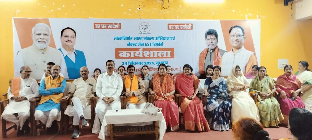 भारतीय जनता पार्टी की आत्मनिर्भर भारत संकल्प एवं जीएसटी नेक्स्ट जेनरेशन 2.0 की कार्यशाला का आयोजन दुर्ग जिला भाजपा कार्यालय में भाजपा जिला अध्यक्ष सुरेंद्र कौशिक की अध्यक्षता एवं भाजपा प्रदेश महामंत्री एवं जीएसटी नेक्स्ट जेनरेशन 2.0 कार्यक्रम के प्रदेश संयोजक यशवंत जैन तथा आत्मनिर्भर भारत संकल्प कार्यक्रम को लेकर मुख्य वक्ता के रूप में रायपुर ग्रामीण विधायक की मोतीलाल साहू की उपस्थिति में संपन्न हुई | आयोजित कार्यक्रम में मंचासीन अतिथि जिला भाजपा अध्यक्ष सुरेंद्र कौशिक, भाजपा प्रदेश मंत्री जितेंद्र वर्मा, महिला मोर्चा प्रदेश अध्यक्ष विभा अवस्थी, पूर्व कैबिनेट मंत्री