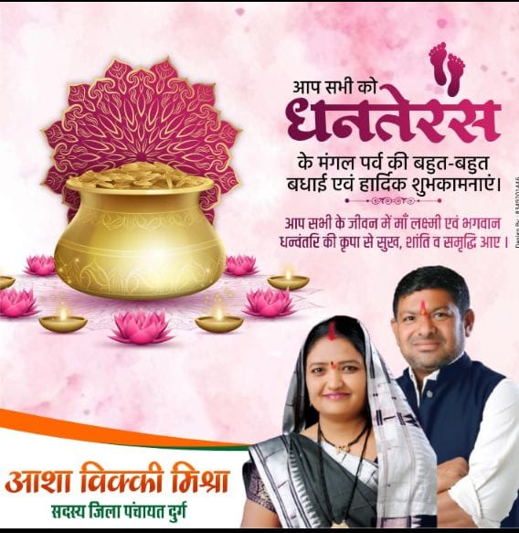 दुर्ग , जिला पंचायत सदस्य दुर्ग श्रीमती आशा विक्की मिश्रा ने प्रदेशवासियों को धनतेरस, दीपावली, गोवर्धन पूजा एवं भाई दूज की हार्दिक बधाई एवं शुभकामनाएं दी है । इन सभी पुण्य त्योहारों के पावन अवसर पर श्रीमती आशा विक्की मिश्रा ने प्रदेशवासियों के सुखी व खुशहाल जीवन और उज्जवल भविष्य की कामना की है.*