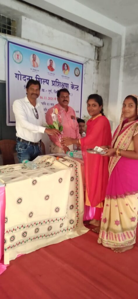 अध्यक्षता सरपंच पूजा चंद्राकर ने किया विशेष अतिथि पूर्व सरपंच घना राम साहू, हस्त शिल्प विकास बोर्ड के नीतीश तराने, पूर्व सरपंच महेश्वरी चंद्राकर , हस्त शिल्प विकास बोर्ड गोदना आर्ट के प्रशिक्षिका दिलबसिया पावले, ऋषि अगरिया, समाज सेवक प्रहलाद चंद्राकर, रोजगार सहायक चंद्रभूषण कोसरे , थे, मंडावी ने बताया कि छ. ग. हस्त शिल्प विकास बोर्ड के प्रबंधक सी. एस. केहरी के मार्ग दर्शन में महिलाओं को शासन की जन कल्याणकारी योजनाओं को आत्म निर्भर बनाने के लिए गोदना आर्ट प्रशिक्षण तीन माह तक दिया जाएगा एवं प्रशिक्षण के दौरान मानदेय के रूप में प्रति दिन पचास की दर से दिया जाएगा और साथ में प्रशिक्षणार्थियों को प्रमाण पत्र दिया जाएगा, हस्त शिल्प का अर्थ होता है वे वस्तुएं जो मुख्य रूप से हाथ से या साधारण औजारों का उपयोग करके बनाई जाती है जिसमें सौंदर्य परक, कलात्मक या सांस्कृतिक महत्व होता हैं