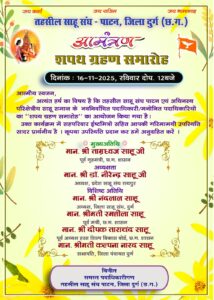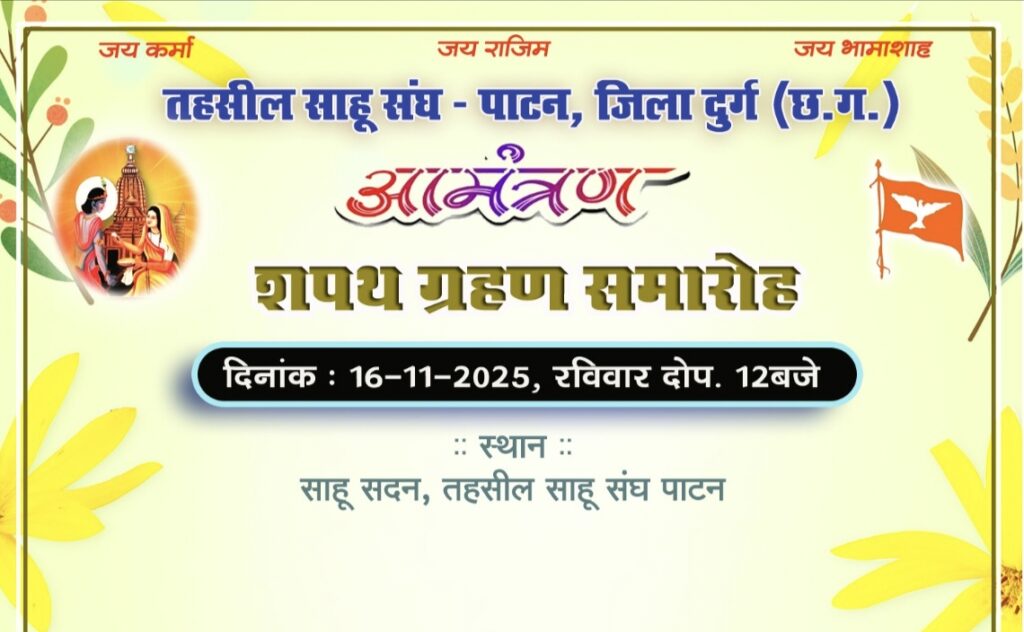 तहसील साहू संघ पाटन जिला दुर्ग के शपथ ग्रहण समारोह का कार्यक्रम 16 नवंबर दिन रविवार को साहू सदन अटारी मे रखा गया है जिसमे तहसील साहू संघ के नवनिर्वाचित अध्यक्ष, पदाधिकारियों सहित कार्यकारिणी पदाधिकारी को शपथ दिलाया जायेगा
