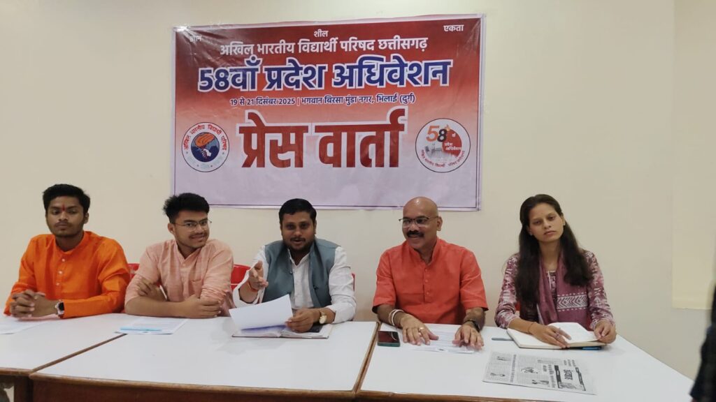 अखिल भारतीय विद्यार्थी परिषद, छत्तीसगढ़ प्रदेश का 58 वां प्रदेश अधिवेशन दिनांक 19, 20 एवं 21 दिसंबर 2025 को दुर्ग जिले के भिलाई स्थित सेक्टर-6 सिविक सेंटर के कला मंदिर में भव्य रूप से आयोजित होने जा रहा है। इस तीन दिवसीय प्रदेश अधिवेशन में छत्तीसगढ़ के समस्त जिलों से 550 से अधिक विद्यार्थी प्रतिनिधि सहभागिता करेंगे, जो संगठन की विचारधारा, कार्यदिशा एवं भावी योजनाओं पर मंथन करेंगे।
