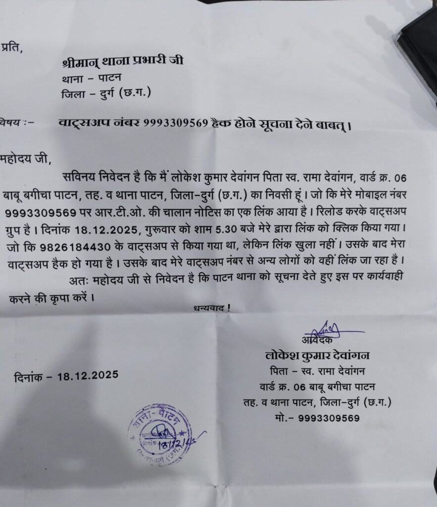 पाटन – आज पाटन मे फिर मोबाईल हैकर द्वारा मोबाईल के व्हाट्सऐप को हैक क़र लिया गया, हैकर द्वारा पीड़ितलोकेश देवांगन के व्हाट्सऐप से लोगो को फर्जी RTO ई चालान ऐप भेजा जा रहा है व लोगो को अपशब्द लिख क़र भेज़ रहे है, इस कृत्य से अनजान लोग लिंक को ओपन क़र हैकर के जाल मे फ़स क़र अपना मोबाईल व व्हाट्सग्रूप साईट के माध्यम से बदनाम हो रहे है हैकर द्वारा वहाट्सप पर मेसेज भेजकर अभद्र व्यवहार भी किया जा रहा है. पीड़ित युवा नें इसकी शिकायत पाटन थाने मे इसकी लिखित शिकायत दर्ज कराया है. व लोगो से इस लिंक को न खोलने व डाऊनलोड नहीं करने की अपील की है.