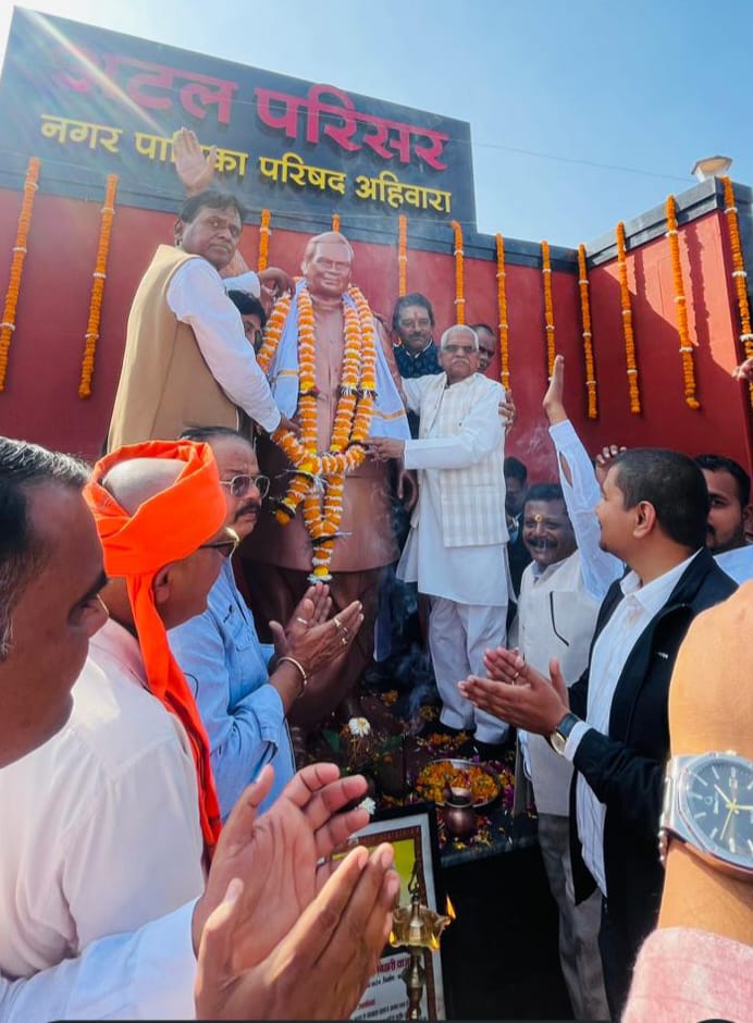 नंदिनी अहिवारा:- पूर्व प्रधानमंत्री स्वर्गीय श्री अटल बिहारी बाजपेई जी की 101 जयंती पर 25 दिसंबर को राज्य के 115 शहरों में नवनिर्मित अटल परिसरों का लोकार्पण किया गया लोकार्पण कार्यक्रम में सभी नगरी निकाय वर्चुअली जुड़ गए, इसी कड़ी में नगर पालिका परिषद अहिवारा में लोकार्पण एवं प्रतिमा का अनावरण अहिवारा विधायक श्रीमान डोमन लाल कोर्सवाड़ा के द्वारा संपन्न हुआ कार्यक्रम के अति विशिष्ट अतिथि विकास की गाथा गढ़ने वाले विधायक डोमन लाल कोर्सवाड़ा ने बताया की अटल जी एक राजनेता ही नहीं बल्कि पत्रकार भी थे अटल परिसर का एक साथ लोकार्पण यह बहुत बड़ा रिकॉर्ड होगा 115 प्रतिमाओं का लोकार्पण शायद ही देश में कहीं और हुआ होगा हम एक बहुत बड़ा रिकॉर्ड बनाने जा रहे हैं भारत सरकार ने अटल जी के जन्म दिवस को सुशासन दिवस के रूप में घोषित किया है उनका सुशासन लोगों को प्रेरणा देता है प्रदेशवासियों को प्रेरणा देता है इस विशेष लोकार्पण कार्यक्रम में विशेष अतिथि नगर पालिका अध्यक्ष विद्यानंद कुशवाहा उपाध्यक्ष अशोक बाफना प्रभारी लोक निर्माण विभाग कीर्ति राजा शिवाले 9 नंबर वार्ड पार्षद ईश्वर शर्मा एवं समस्त नगर पालिका के वार्ड पार्षद एवं पालिका के सीएमओ अंकुर पांडे इंजीनियर कुल्हारे भाजपा के वरिष्ठ कार्यकर्ता भूपेंद्र सिंह लक्ष्मण छतरी एवं समस्त भाजपा के कार्यकर्ता नगर पालिका के कर्मचारी एवं नगरवासी उपस्थित रहे