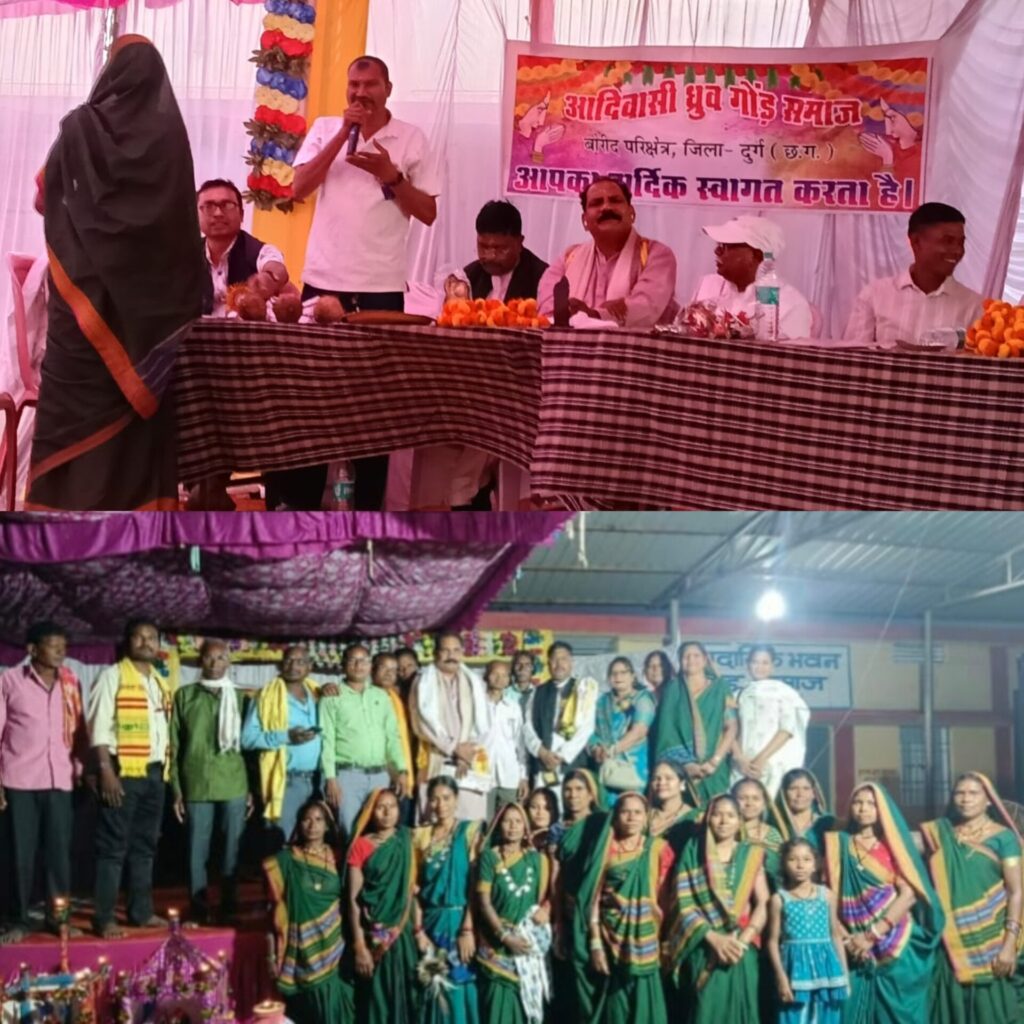 ग्राम खमरिया (पाटन) में आदिवासी ध्रुव गोंड समाज बोरिद परिक्षेत्र के तत्वधान में वार्षिक अधिवेशन मनाया गया कार्यक्रम के मुख्य अतिथि कमलेश शोरी केन्द्रीय गोंडवाना अध्यक्ष धमधा गढ़, विशेष अतिथि जयपाल सिंह ठाकुर सचिव धमधा गढ़, पूर्व अपर कलेक्टर एम. एस.ठाकुर, संरक्षक गोंड समाज थानसिंह मंडावी, जनपद प्रतिनिधि बिष्णु निषाद, सरपंच डोनेश्वर साहू, महिला प्रभाग अध्यक्ष बोरिद परिक्षेत्र , संरक्षक पाटन राज कमलेश नेताम, प्रवक्ता पाटन राज दुलार सिंह ठाकुर, उपाध्यक्ष पाटन राज उमाशंकर ठाकुर, मेघनाथ नेताम, सचिव पाटन राज जीवन लाल ठाकुर, सांस्कृतिक सचिव जगन्नाथ ठाकुर , महिला प्रभाग अध्यक्ष संगीता शोरी, युवा प्रभाग अध्यक्ष दीपेश मंडावी, उपसरपंच माधुरी मंडावी थे।कार्य क्रम की प्रथम चरण में गोंड समाज के महिलाओं ने ईशर गौरा गौरी की बाजा गाजे के साथ गली भ्रमण करते हुए शोभा यात्रा निकाली गई समाज के बच्चे के द्वारा सांस्कृतिक कार्यक्रम प्रस्तुति की गई एवं समाज के छात्र छात्राओं ने जिन्होंने बोर्ड परीक्षा व खेल कूद प्रतियोगिता में प्रथम स्थान लाया गया है उनको प्रशस्तरी पत्र देकर सम्मान किया गया समस्त अतिथियों का पीला चावल, साल श्रीफल से सम्मान किया गया अतिथियों ने अपने उदबोधन में कहा कि छ ग के प्रथम स्वतंत्रता संग्राम सेनानी सोना खान के राजा शहीद वीर नारायण सिंह थे जिन्होंने अग्रेजों से लोहा लेकर शहीद हो गए आदिवासी समाज प्रकृति के पुजारी हैं आदिवासियों की परम्परा,संस्कृति, व रीति रिवाज छ. ग. की धरोहर हैं मंच संचालन बी.आर.ठाकुर ने किया,इस अवसर पर मोहन नेताम, जगनू राम ठाकुर, धनाजी राम धुर्वे,दौलत नेताम, कैलाश ठाकुर, राजेंद्र नेताम, नोवील सिंह ठाकुर, आदित्य करियांम,बीरबल सिंह, मेघनाथ राम साय, सुखचैन साहू, संजय ठाकुर, नरसिंह ठाकुर, नंदू ठाकुर, टेमन ठाकुर, बीरेंद्र ठाकुर, जीवन लाल ठाकुर, भीम ठाकुर, छबि ठाकुर,दिनेश ठाकुर,विक्की ठाकुर,रजिया ठाकुर, सरोज ठाकुर,कुंती ठाकुर, गिरिजा ठाकुर,निधि ठाकुर, दुर्गा नेताम, मुकेश ठाकुर, चमेली ठाकुर, थालेंद्र ठाकुर, पवन ठाकुर सहित समस्त ग्रामवासी व आदिवासी समाज के लोग उपस्थित थे