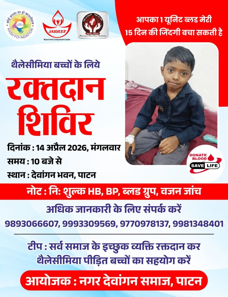 पाटन। नगर देवांगन समाज, पाटन द्वारा मानवता की मिसाल पेश करते हुए थैलेसीमिया से पीड़ित बच्चों के जीवन की रक्षा हेतु एक विशाल रक्तदान शिविर का आयोजन किया जा रहा है। यह आयोजन आगामी 14 अप्रैल 2026, मंगलवार को पाटन के देवांगन भवन में संपन्न होगा।